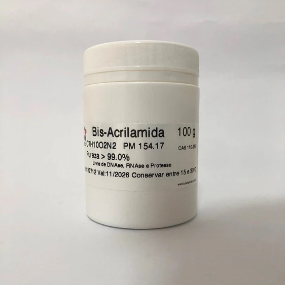 A Bis-Acrilamida (N,N’-Metileno-bis-acrilamida) é um reagente essencial utilizado na preparação de géis de poliacrilamida, sendo amplamente aplicada em eletroforese para separação de proteínas e ácidos nucleicos. Sua função principal é atuar como agente de reticulação, garantindo a estrutura ideal do gel para análises laboratoriais.